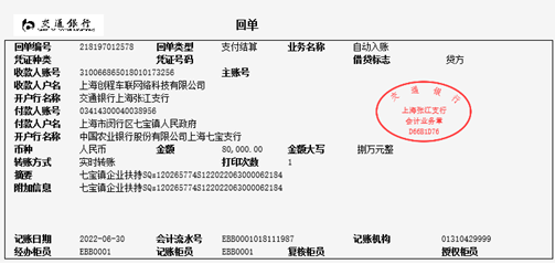 2022年630日,我司收到上海市閔行區(qū)七寶鎮(zhèn)人民政府企業(yè)扶持專項(xiàng)首筆資金8萬元,預(yù)計(jì)下半年會(huì)獲得剩余尾款7萬元。